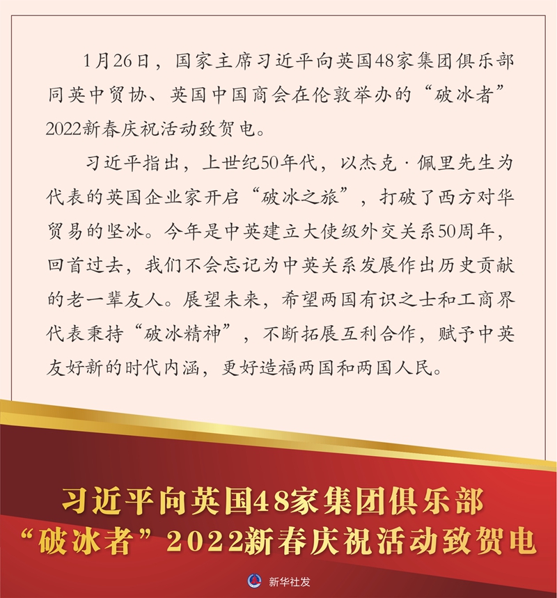 新華社北京1月26日電 1月26日,國家主席習近平向英國48家集團俱樂部同英中貿協、英國中國商會在倫敦舉辦的“破冰者”2022新春慶祝活動致賀電。