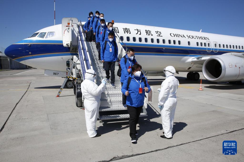 2020年4月20日,在吉爾吉斯斯坦首都比什凱克瑪納斯國際機場,中國赴吉爾吉斯斯坦聯合工作組成員走下飛機。聯合工作組隨機攜帶了由新疆維吾爾自治區捐贈的一批抗疫醫療物資。新華社發(羅曼攝)