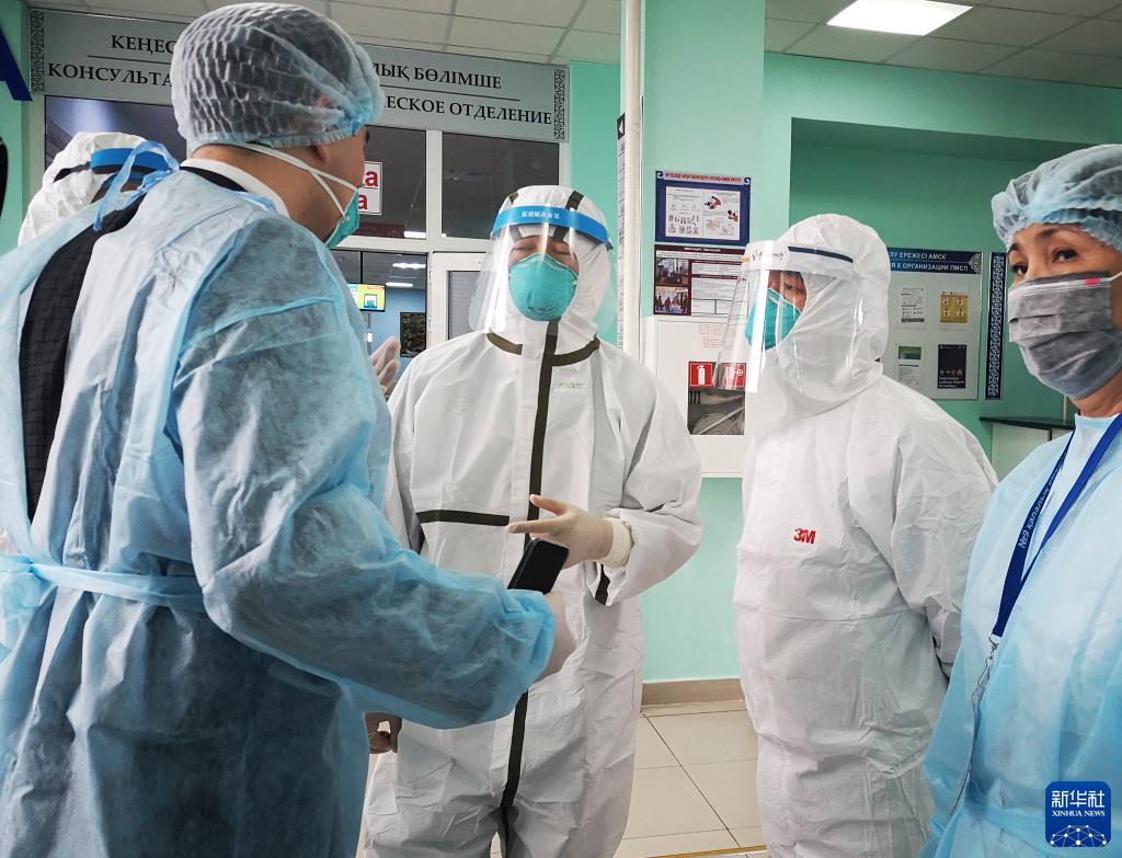 2020年4月14日,在哈薩克斯坦努爾蘇丹第九綜合醫院,中國援哈醫療隊成員與哈薩克斯坦醫護人員交流如何優化醫院管理減少院內感染。新華社發(哈薩克斯坦實業報供圖)
