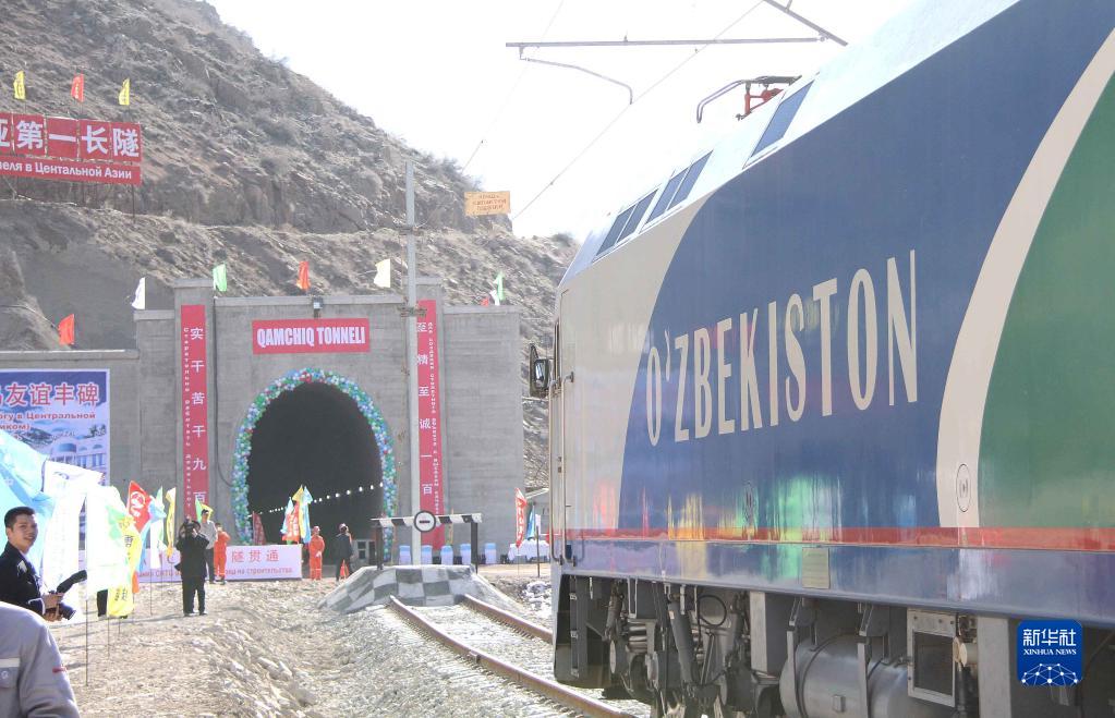 2016年2月27日,一列專列停在烏茲別克斯坦安格連-帕普鐵路卡姆奇克隧道進口。中國政府優買項目、中鐵隧道集團承擔的中亞最長隧道——烏茲別克斯坦安格連-帕普鐵路卡姆奇克隧道2月27日全隧貫通。卡姆奇克隧道長19.26公里,是中亞第一長隧。新華社記者沙達提攝