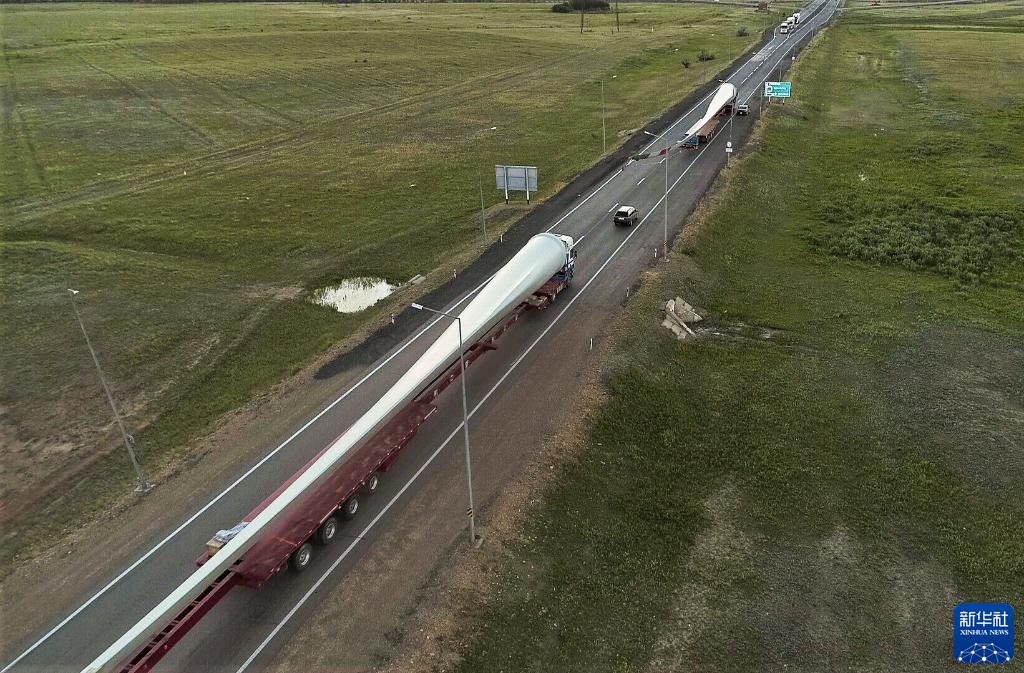 2020年6月23日,在哈薩克斯坦卡拉干達至努爾蘇丹段公路,卡車車隊運輸70米長的風機葉片(無人機拍攝)。新冠疫情期間,中國和哈薩克斯坦克服困難,繼續推動新能源領域合作。中國生產的風電設備跨越數千公里運輸至哈薩克斯坦,助力哈薩克斯坦可再生能源項目。新華社發(奧斯潘諾夫攝)