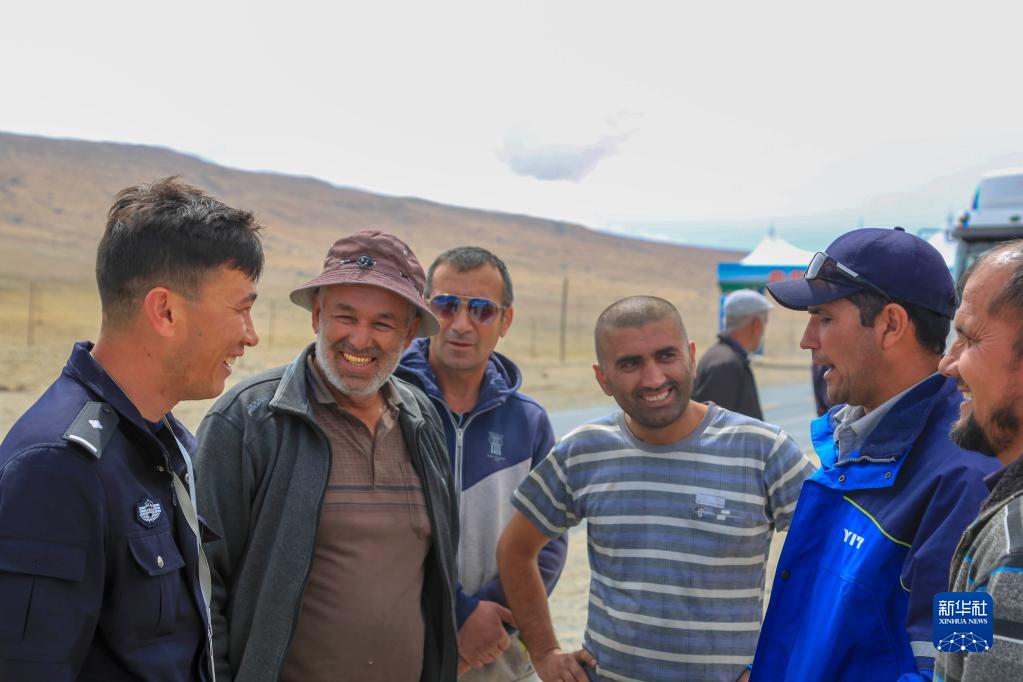 2019年6月11日,位于新疆塔什庫爾干塔吉克自治縣的卡拉蘇出入境邊防檢查站的民警向塔吉克斯坦司機介紹出入境相關事宜。新華社發(黃歡 攝)