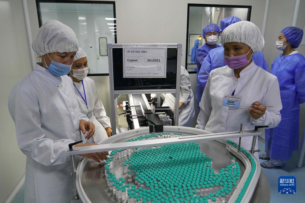 2021年9月5日,在烏茲別克斯坦制藥企業祖拉貝克實驗室有限公司,工作人員在新冠重組蛋白疫苗生產線上工作。由中國科學院微生物研究所和安徽智飛龍科馬生物制藥有限公司共同研發的新冠重組蛋白疫苗在烏茲別克斯坦制藥企業祖拉貝克實驗室有限公司正式投產,這是該國首次實現中國新冠疫苗本地化生產,也是該款新冠重組蛋白疫苗的生產線首次在國外落地。新華社發(扎法爾攝)