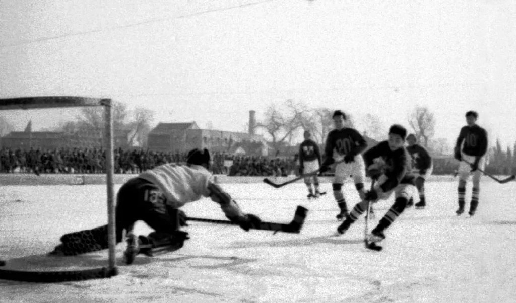 1953年,華北區(qū)冰上運(yùn)動(dòng)會(huì),北京隊(duì)與天津隊(duì)的冰球比賽。(圖源:人民畫報(bào))