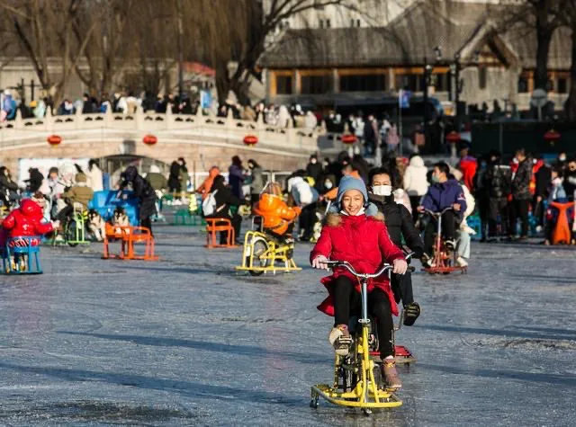 今年1月,什剎海冰場(chǎng)如期開放。冬日的陽光灑在冰面上。小組看到,除了滑冰,這里還有冰上自行車、冰車小海豹、冰上碰碰車等娛樂設(shè)施,儼然一個(gè)老幼皆宜的大型游樂場(chǎng)。
