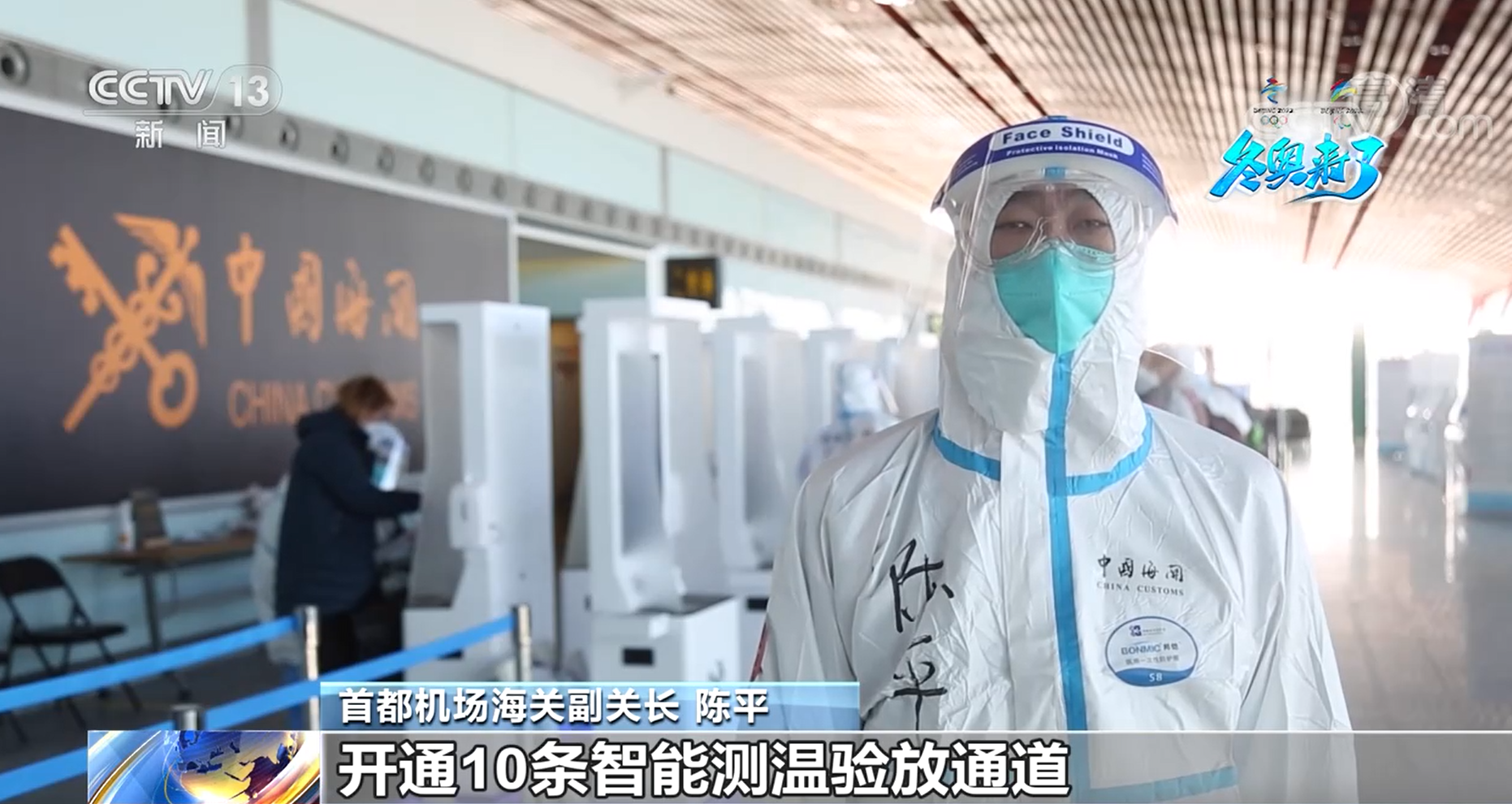 首都機場海關副關長 陳平:我們可以實現12種語言自助健康申報、遠程核驗、閘機自動放行、測溫無感錄入等功能,開通10條智能測溫驗放通道,對所有涉冬奧航班實施“一機一策”,做到嚴格監管、精準檢疫、高效服務。