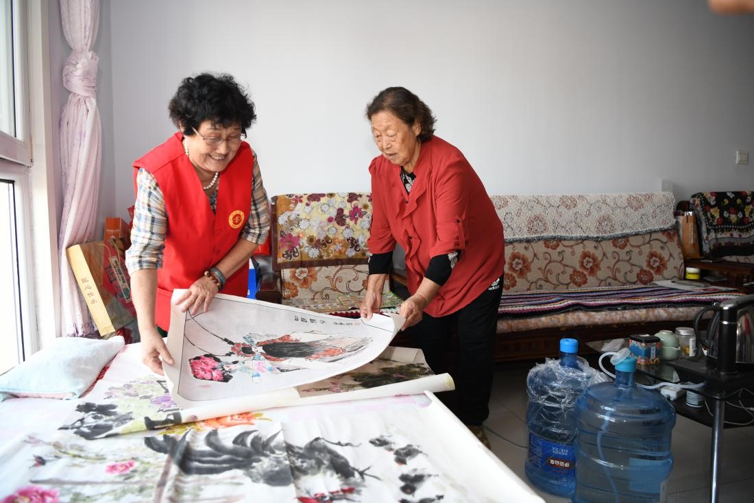 濱河社區志愿者和老人一起欣賞繪畫作品。陳琦嘉 攝