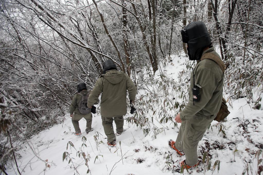 冰雪覆蓋的山林格外安靜,三人從鄉(xiāng)村公路走到林間小路,雪越來(lái)越厚,林越來(lái)越密。韓永璞拿著鐮刀,砍著攔路樹枝,在密林里鉆了10多分鐘,終于到達(dá)山頂?shù)牡?6號(hào)鐵塔。