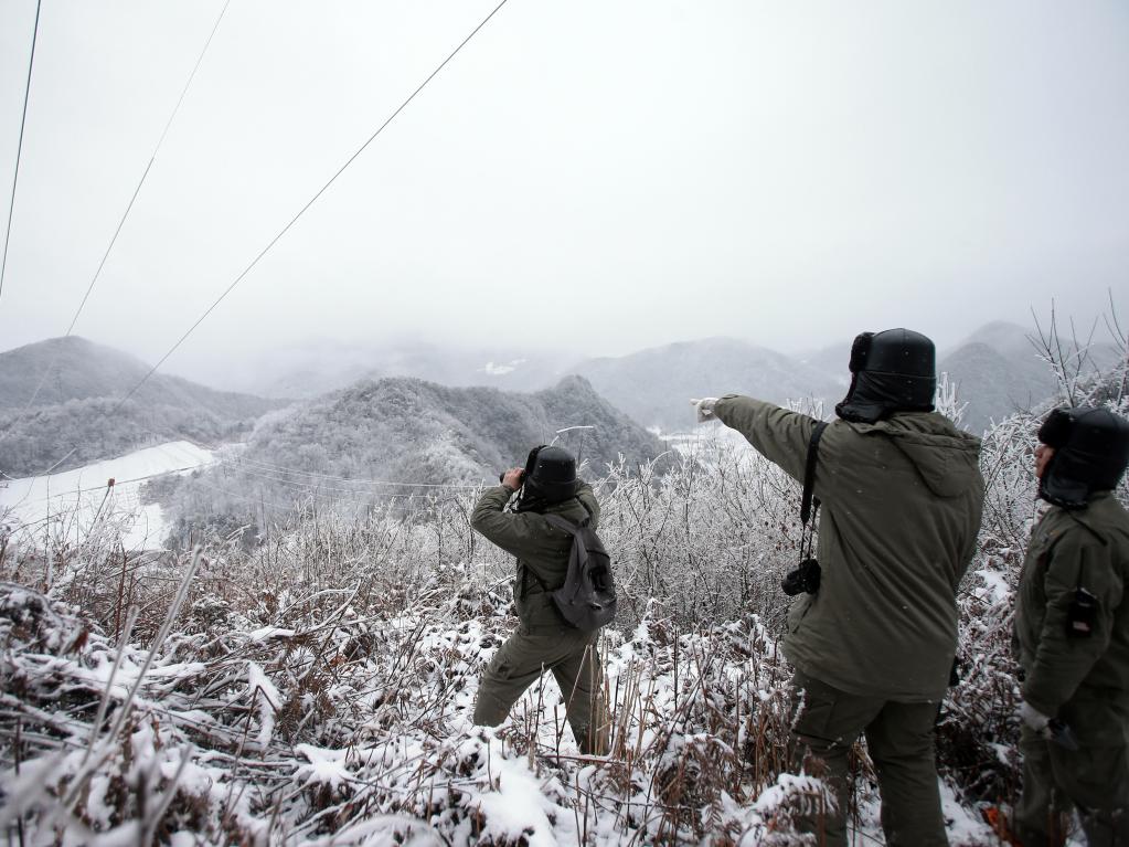 輸電運(yùn)檢人員用望遠(yuǎn)鏡觀察線路的覆冰情況。(受訪者供圖)