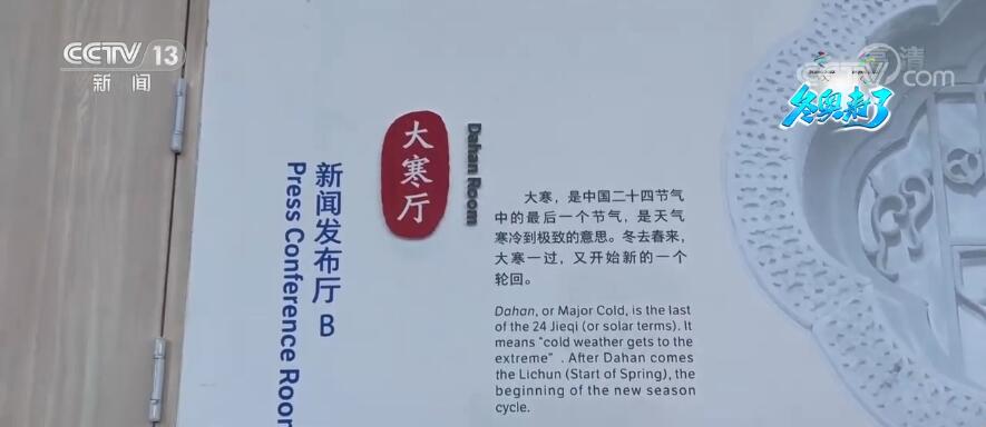 大家看到?jīng)]有,在主媒體新聞中心的很多中國元素,不僅僅體現(xiàn)在一些恢弘大氣的裝飾上,還體現(xiàn)在這種細(xì)節(jié),比如說這個新聞發(fā)布廳,它的名字叫大寒廳,是用咱們的24節(jié)氣來命名的。當(dāng)然光有中文還不夠,還需要用英文來解釋,讓更多的外國記者了解到大寒的來源。我們看看旁邊的廳是什么,我相信肯定也是24節(jié)氣中的一個,你看,這個就叫驚蟄廳,另外叫冬至廳,非常有意思。