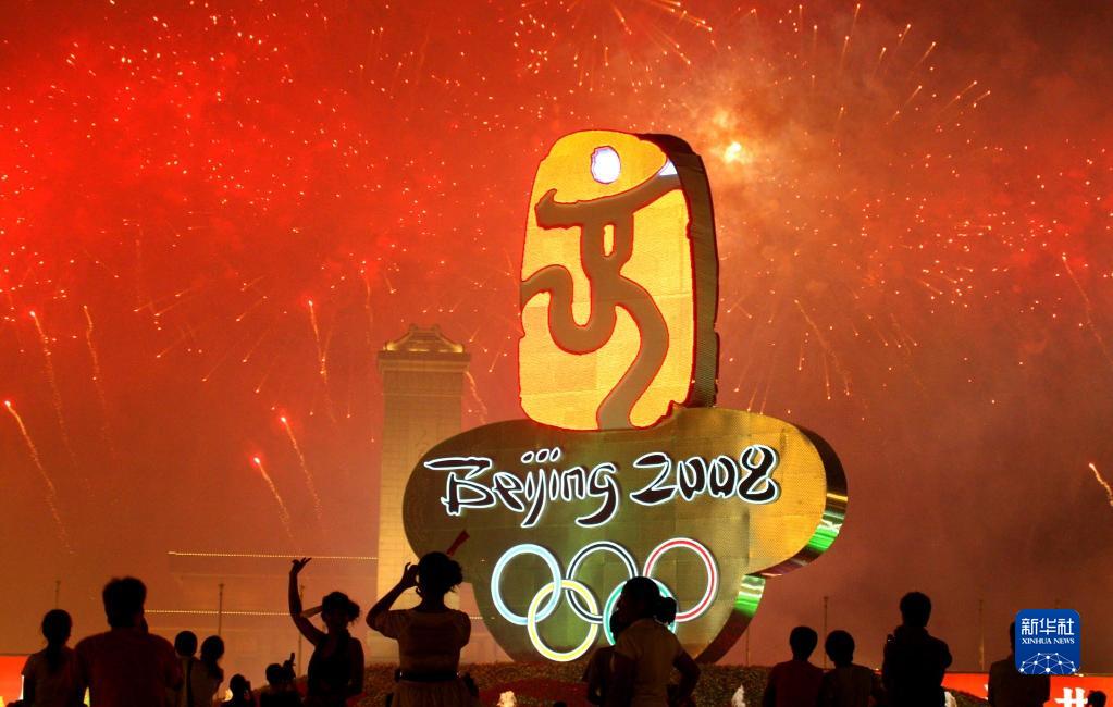 這是2008年8月8日晚,群眾在天安門廣場觀賞焰火。新華社發(吳長青攝)