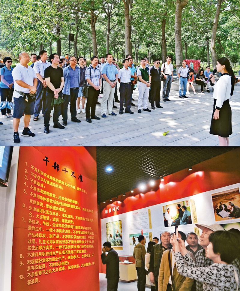 1966年2月,長篇通訊《縣委書記的榜樣——焦裕祿》播發,焦裕祿的名字傳遍千家萬戶,成為共產黨人的光輝典范和全體黨員干部崇敬的榜樣。黨的十八大以來,習近平總書記多次勉勵廣大黨員干部學習弘揚焦裕祿精神,做焦裕祿式的好干部。上圖為2017年8月9日,黨員干部在焦裕祿干部學院聆聽焦桐的故事(新華社記者 馮大鵬/攝);下圖為2014年5月5日,干部群眾在焦裕祿同志紀念館觀看“干部十不準”展板(新華社記者 朱祥/攝)。