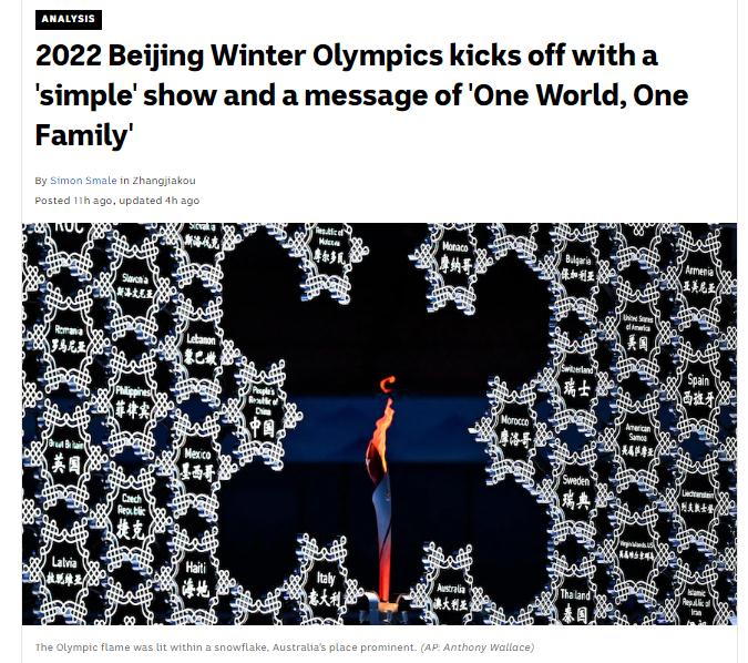 澳大利亞廣播公司(ABC)刊文稱,受疫情因素等影響, 2022北京冬奧會開幕式持續了僅約兩個小時,參與現場表演的約為3000人,而2008年奧運會為15000人。而且,此次參與演出的大多數是普通人,而不是專業演員。5日的開幕式雖與2008年那場驚艷世界的開幕式風格不同,但依然令人回味無窮,令人驚嘆的編舞和現場視覺效果尤其令人記憶深刻。但更令人印象深刻的是,此次開幕式將 “世界一家”的思想貫穿始終,促使人們去關注和思考奧運會如何讓人們團結在一起,這也正是奧林匹克運動的使命。在新冠疫情依然肆虐、世界分裂和對抗愈演愈烈的當下,這顯得更加意義重大。