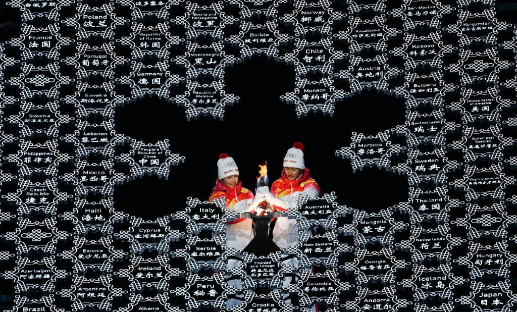 ↑這是最后一棒火炬手迪妮格爾·衣拉木江(左)和趙嘉文將火炬嵌入“大雪花”中央。新華社記者李尕攝