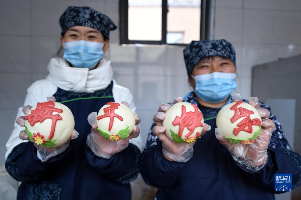 1月28日,在河北省平山縣西柏坡鎮北莊村團結食堂,工作人員展示制作的特色面食。新華社記者 駱學峰 攝