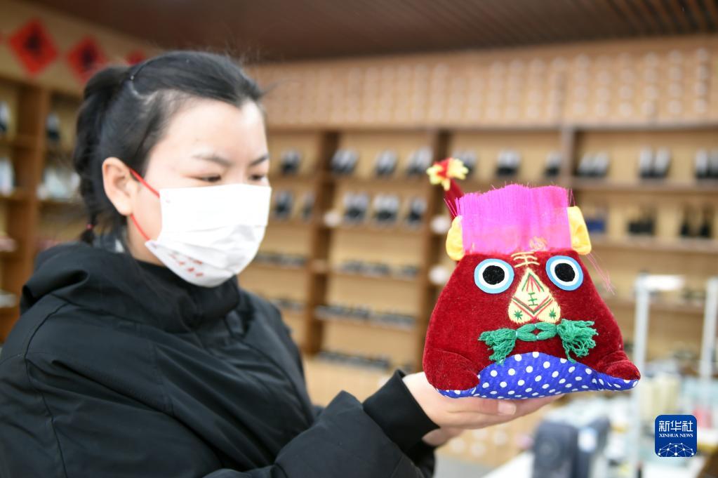 1月28日,在河北省平山縣西柏坡鎮北莊村西柏坡文創館,工作人員展示特色文創產品。新華社記者 駱學峰 攝