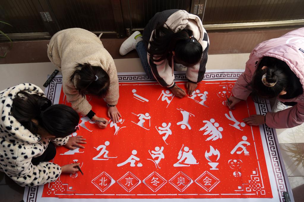 農歷壬寅年到來之際,在河北省臨城縣東鎮鎮南孟村,村民圍繞“迎冬奧”主題剪紙。新華社發(陳雷攝)