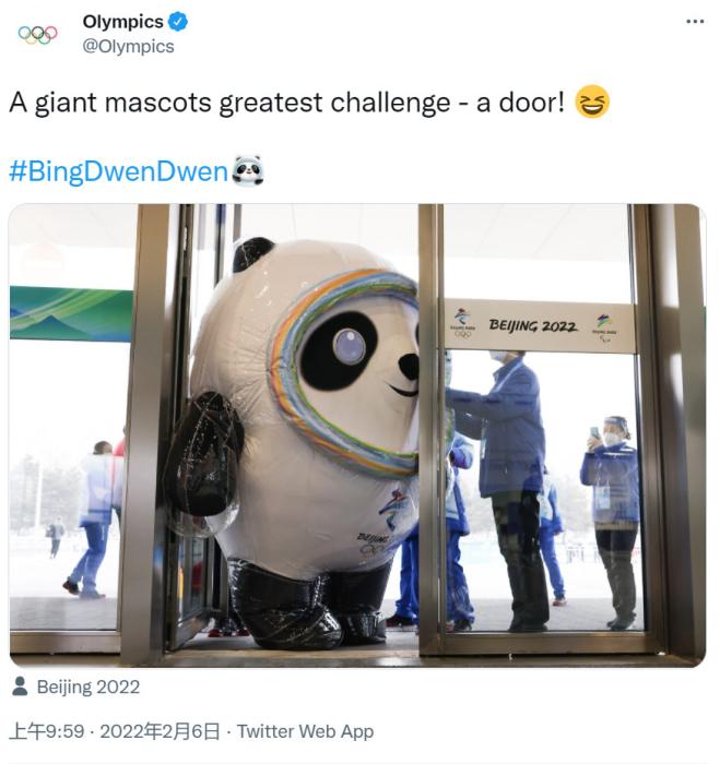 奧運(yùn)會(huì)官方英文推特賬號(hào)2月6日發(fā)布了一張冰墩墩卡在門里的照片,配文寫道“一個(gè)巨大的吉祥物最大的挑戰(zhàn)——一扇門”,獲得了1000多次轉(zhuǎn)發(fā)和5000多個(gè)贊。