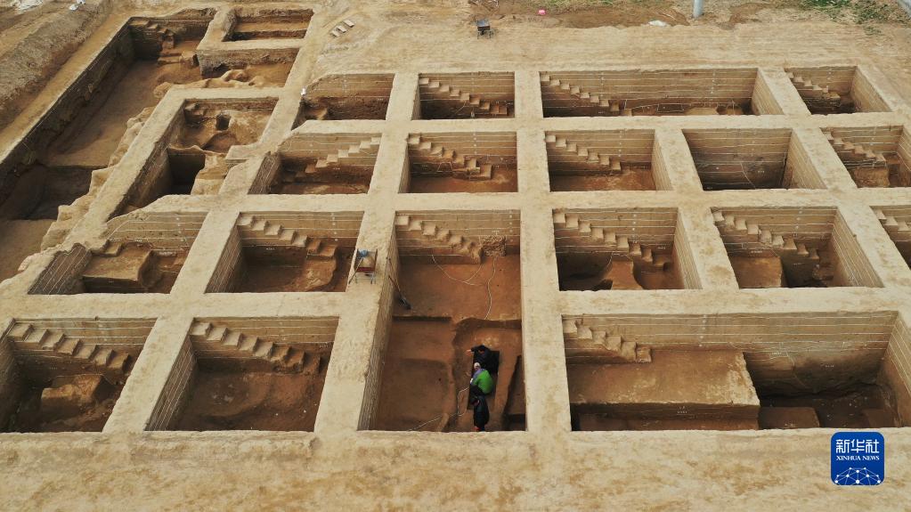 考古隊員在河北雄安新區(qū)南陽遺址考古發(fā)掘現(xiàn)場工作(2021年3月19日攝,無人機照片)。新華社記者 牟宇 攝