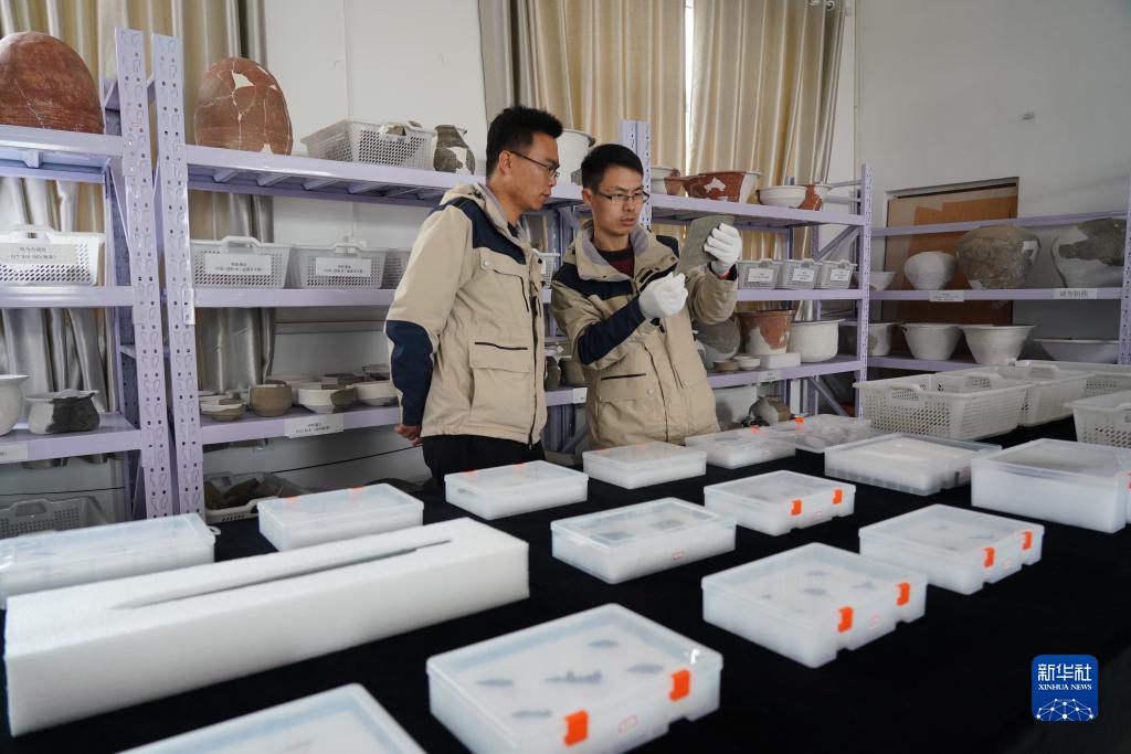 考古隊員在研究河北雄安新區(qū)南陽遺址的出土器物(2021年3月19日攝)。新華社記者 牟宇 攝
