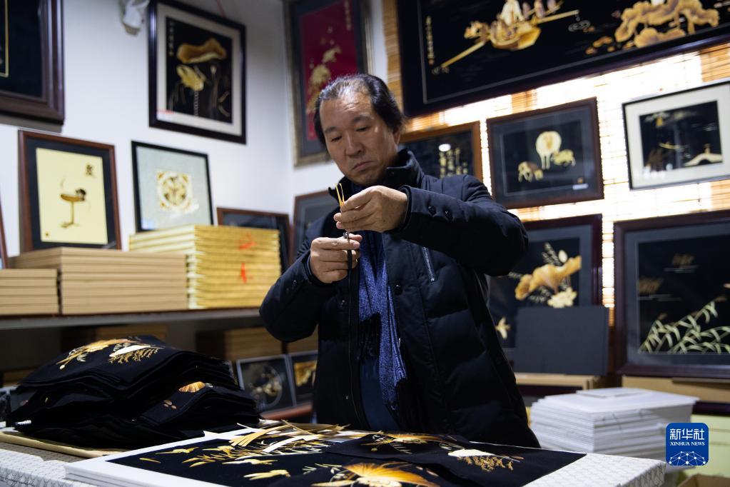 河北省非物質(zhì)文化遺產(chǎn)蘆葦畫技藝傳承人楊丙軍在制作蘆葦畫(2019年1月8日攝)。新華社發(fā)(王京卓 攝)