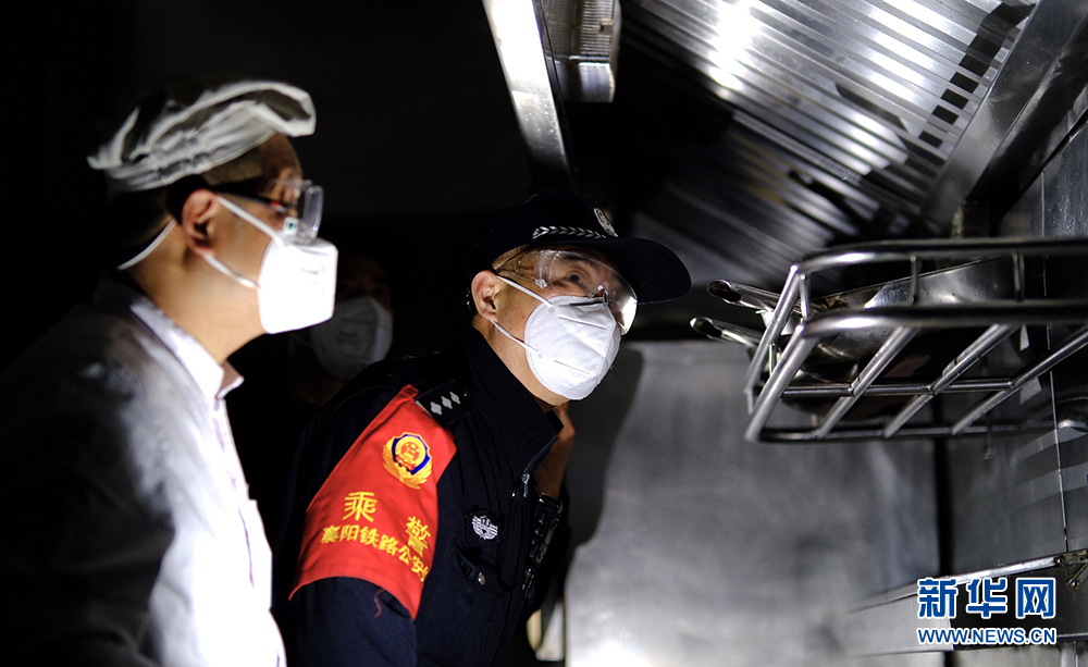 乘警蔣大兵檢查列車餐車消防安全情況。新華網發 賀瑞明攝