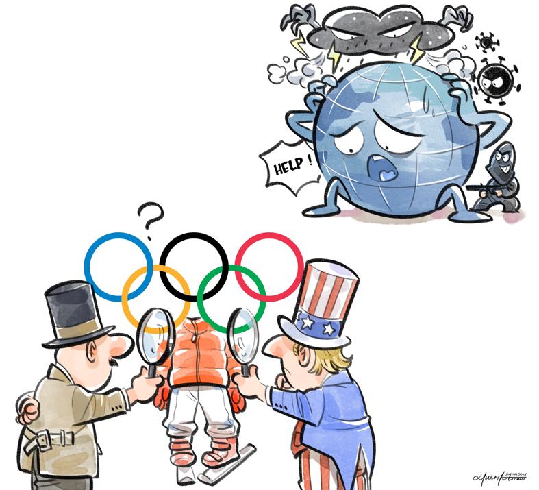 西方不應該把奧運政治化,新冠疫情、氣候變化、恐怖主義才是全球應當共同應對的危機。(漫畫作者:中國日報美術部 李旻)