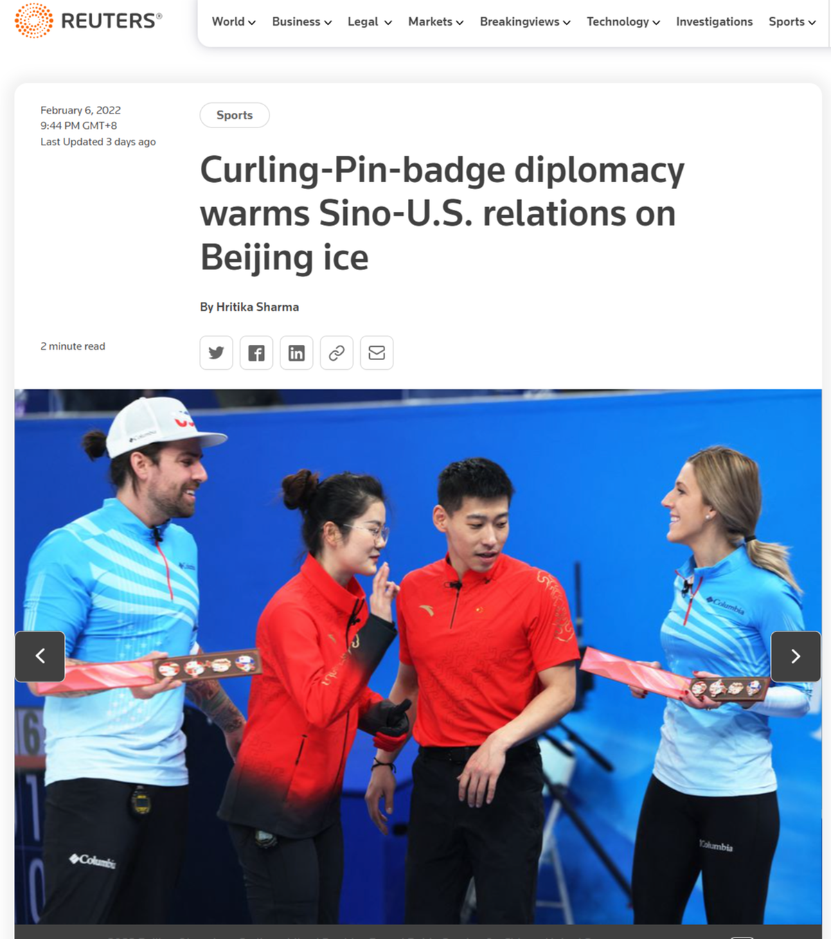 5日,中國冰壺混雙組合在與美國隊比賽結束后,拿出一組“冰墩墩”奧運紀念徽章,贈送給美國隊員。兩國運動員賽后親切合影,成為“暖心”一幕。外媒評論稱,無論冰上競賽多么激烈,中美運動員之間相互尊重的友誼卻如此溫暖,能夠推動中美關系升溫。