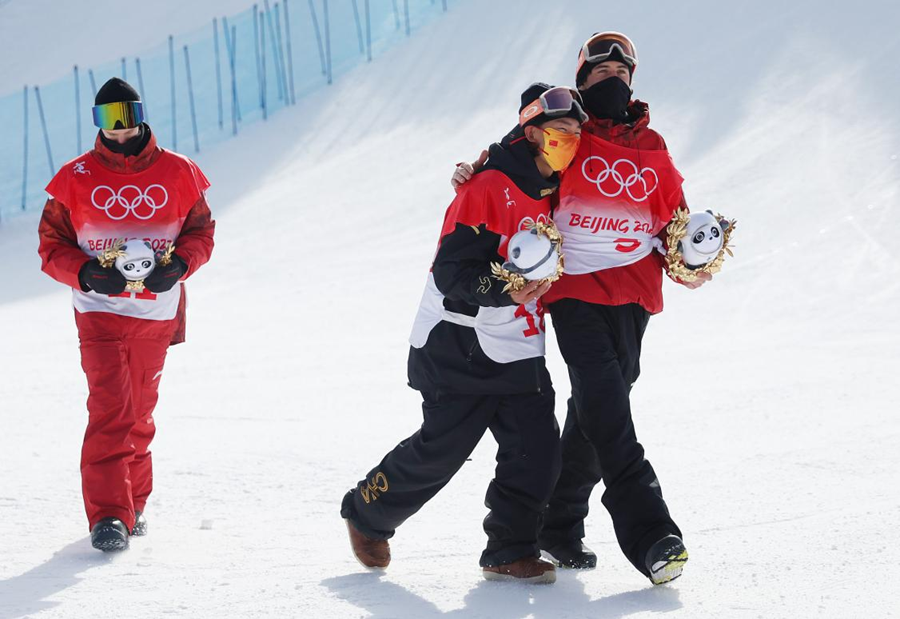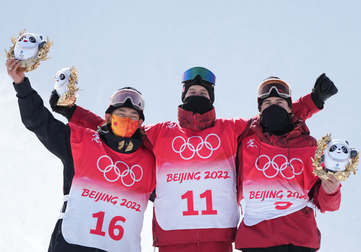 2月7日,獲得冠軍的加拿大選手馬克斯·帕羅特(中),獲得亞軍的中國選手蘇翊鳴(左)和獲得季軍的加拿大選手馬克·麥克莫里斯在頒發紀念品儀式上。新華社記者 楊世堯攝
