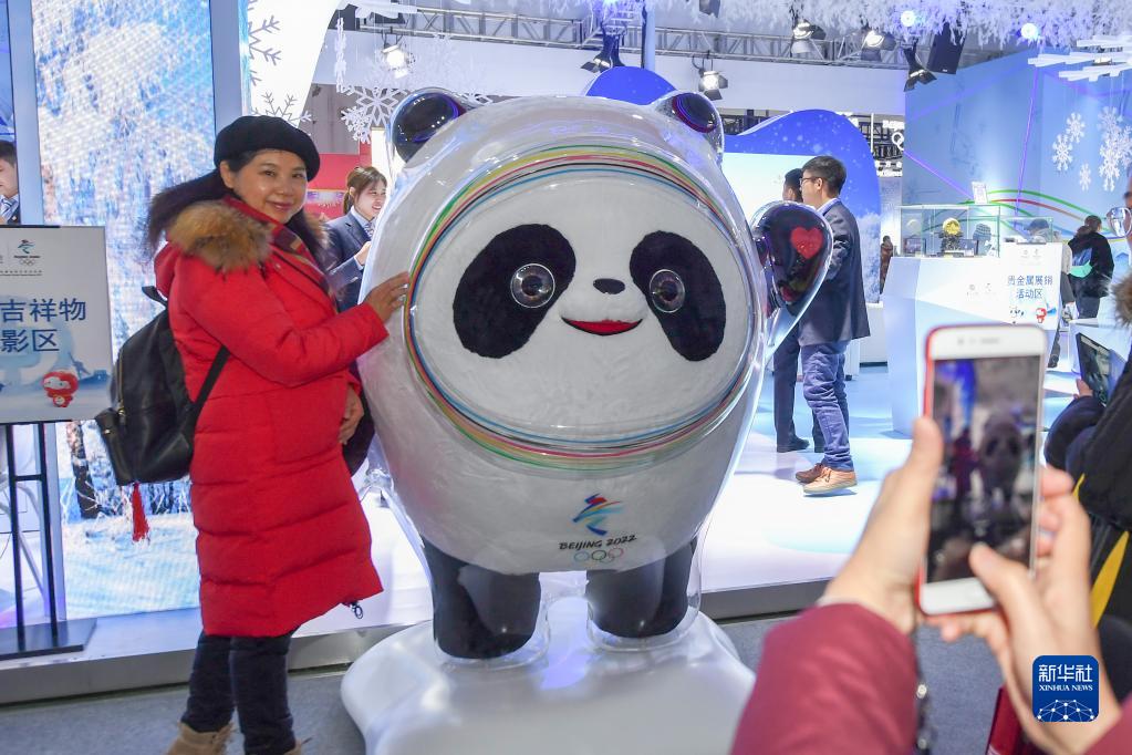 2019年12月13日,參觀者在第四屆吉林雪博會展會現場與北京2022年冬奧會吉祥物“冰墩墩”合影。新華社記者張楠攝