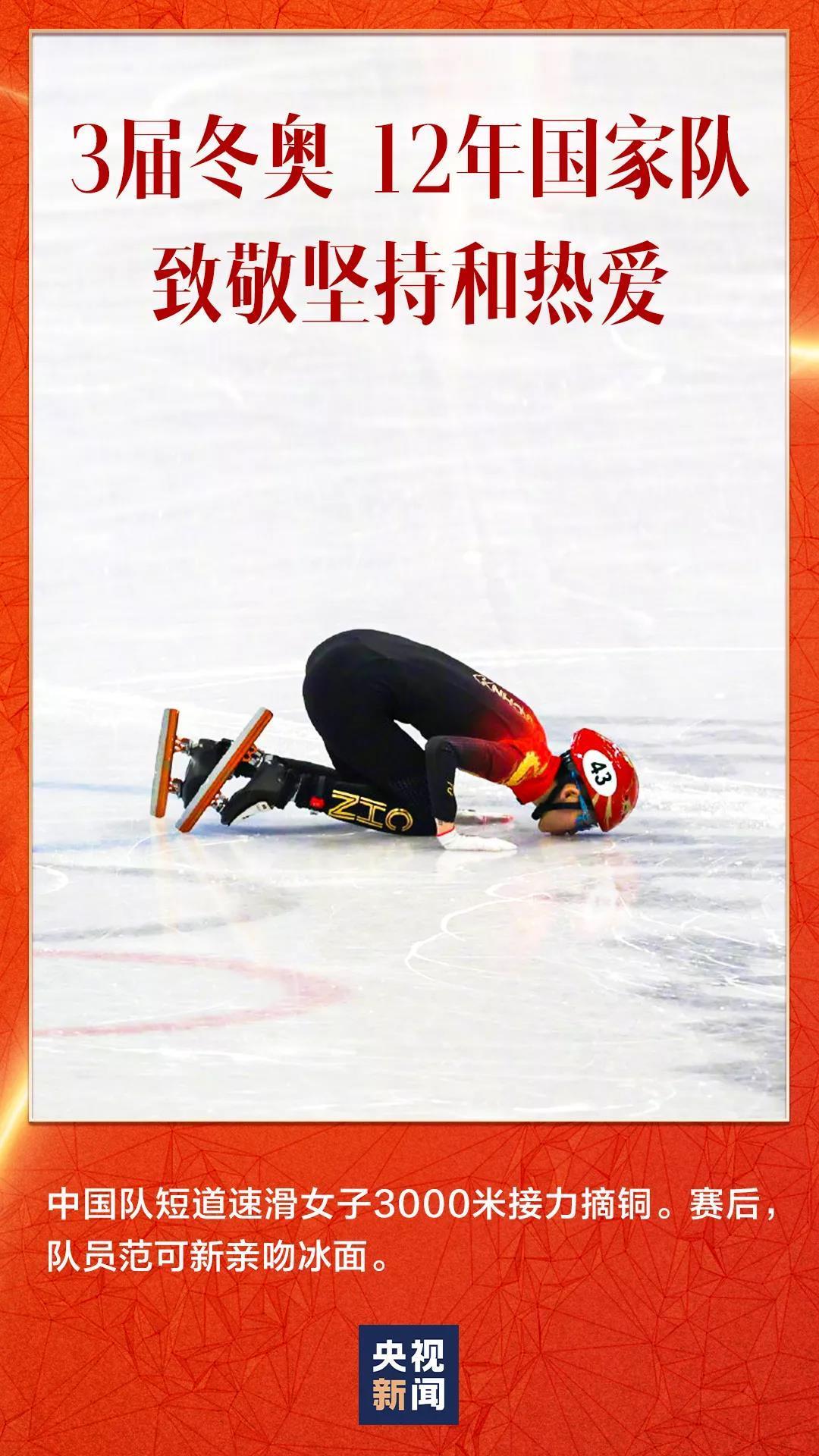 賽后,范可新動情地跪地親吻冰面,展現了一名老將的堅持和柔情。范可新說,親吻冰面是想感謝強大的祖國,能舉辦冬奧會,能讓更多我們國家的運動員在祖國的冰面上向世界展現自己!