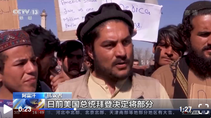 阿富汗抗議者:日前,美國總統拜登決定將部分被凍結的阿富汗資產分配給“9·11”事件受害者,因此我們在這里抗議。我們要問國際社會,美國怎么能決定將阿富汗人民的資產用于(賠償)“9·11”事件受害者?抗議將出現在阿富汗每個省份,作為一名阿富汗青年,我呼吁阿富汗人民站出來抗議,捍衛自己的權利。