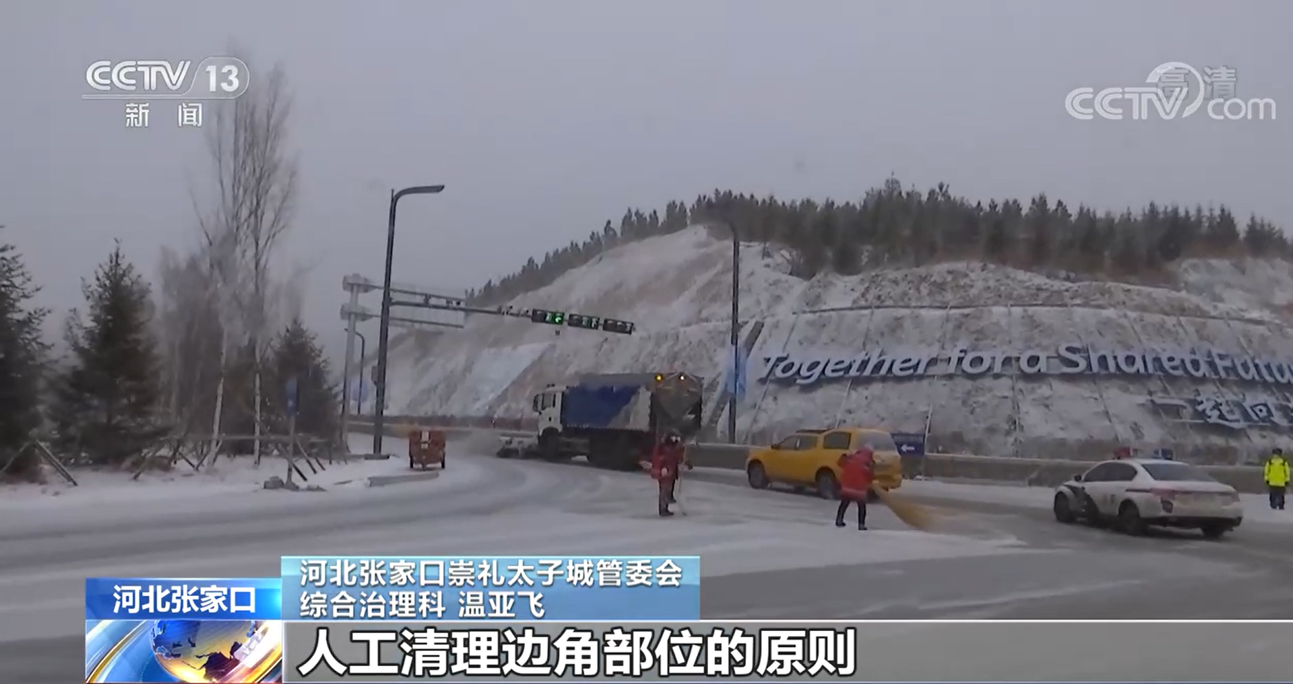 河北張家口崇禮太子城管委會綜合治理科 溫亞飛:我們按照先掃出一條道露出地面,人工清理邊角部位的原則,確保奧運道路暢通、奧運賽事正常運行。