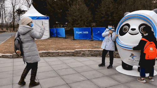 圖為海淀冬奧文化廣場門口,作為冬奧“頂流”的冰墩墩和雪容融吸引游客合影留念。女孩在冰墩墩前擺pose,媽媽趕忙拿起手機拍攝。中工網(wǎng)記者 劉云攝