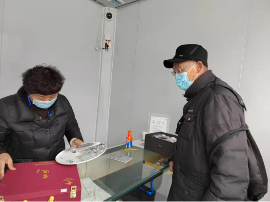 圖為游客買到心儀的冬奧特許商品后,工作人員把商品裝入精美的包裝盒。中工網(wǎng)記者 劉云攝