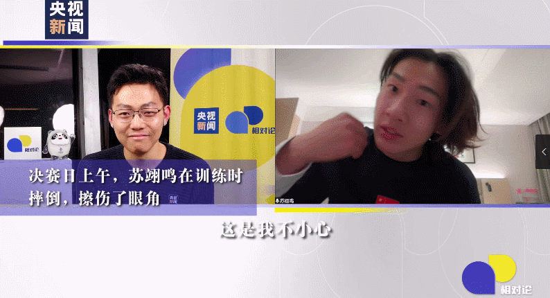 蘇翊鳴:這是我不小心磕到的,有一個傷痕,會有一點點緊張。可能因為角度或者是落地的問題,雪鏡往下竄了一點,正好碰到臉的位置。