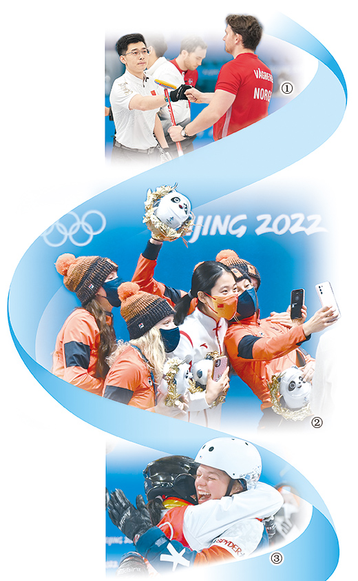 圖①:2月15日,男子冰壺循環賽中,中國隊選手許靜韜(前左)在一場比賽結束后與挪威隊選手芒努斯·沃格貝里碰拳致意。