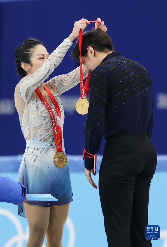 2月19日,中國選手隋文靜(左)在獎牌頒發(fā)儀式上為隊友韓聰戴上金牌。