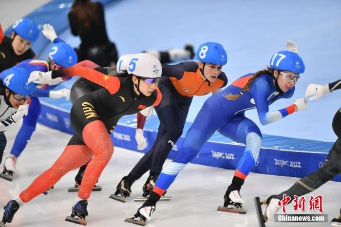 2月19日,北京2022年冬奧會速度滑冰女子集體出發決賽在國家速滑館“冰絲帶”舉行。圖為中國隊選手李奇時(5號)在比賽中。 中新社記者 李駿 攝