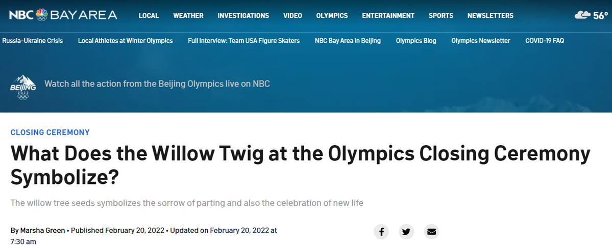 中國日報網2月21日電 “又一屆冬奧會落下帷幕,每一次的閉幕儀式中,都會有歡樂、慶祝和反思的時刻!碑數貢r間20日,美國國家廣播公司NBC報道了一篇題為《奧運會閉幕式上的柳枝象征著什么?》的文章,揭秘了閉幕式以“折柳”作為“緬懷”主題的深刻寓意及主創團隊的獨具匠心。