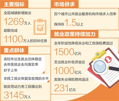 看主要指標,全國城鎮新增就業1269萬人,超額完成1100萬人的目標任務;全年全國城鎮調查失業率平均值為5.1%,比上年平均值下降0.5個百分點,就業目標任務圓滿完成。