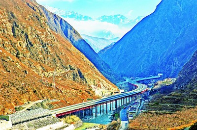 “超級(jí)工程”讓天塹變通途,助力西部邁上高質(zhì)量發(fā)展之路,為共同富裕提供重要支撐。圖為起于四川阿壩藏族羌族自治州汶川縣,止于馬爾康市的汶馬高速公路克枯大橋。新華社發(fā)