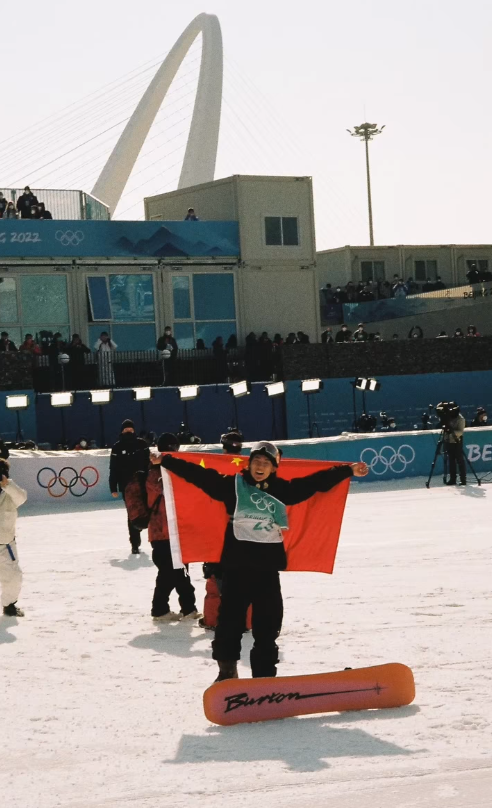 還有一張是蘇翊鳴笑容燦爛地張開雙臂,身披中國國旗慶祝的照片。