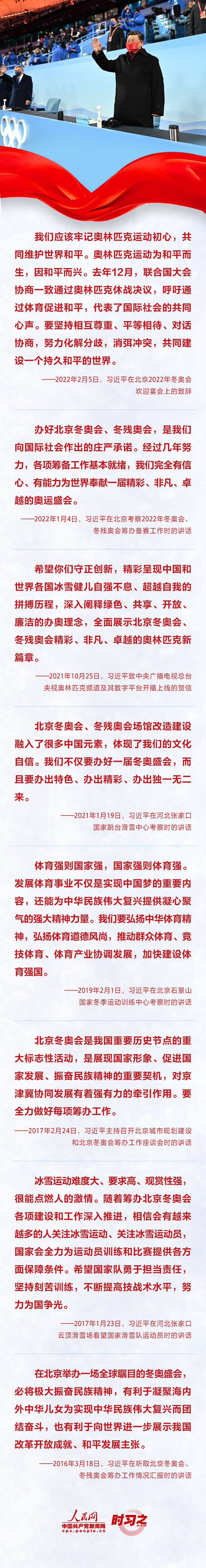 2022年2月20日晚,2萬盞燈籠點亮國家體育場,“中國紅”與“冰雪白”交相輝映,舉世矚目的北京冬奧會在運動員們的歡樂聚會中落下帷幕。冬奧競技場上,一個個精彩瞬間、一幕幕動人場景,使人心潮澎湃。同筑冰雪夢,一起向未來。讓我們重溫習近平的鏗鏘話語,共同感受體育傳遞出的強大精神力量。