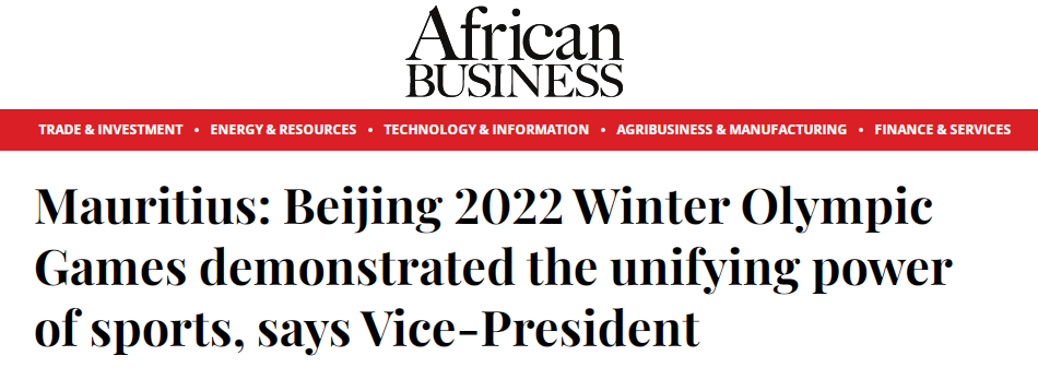 據(jù)非洲商業(yè)媒體African Business報道,為祝賀北京冬奧會勝利閉幕,當?shù)貢r間2月21日,由毛里求斯新唐人街基金會(New China Foundation)舉辦的主題活動在當?shù)嘏e行。與會嘉賓一致認為,中國克服新冠疫情帶來的諸多困難,高質(zhì)量舉辦冬奧會,讓全世界人民見證了中國和奧林匹克運動的魅力,也用實際行動展示了中國在促進團結(jié)與合作中所做出的努力,為世界各國樹立了典范。