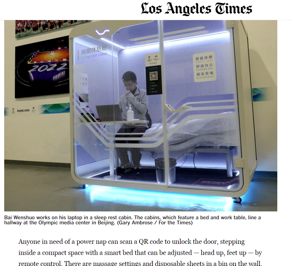 媒體中心寬闊的走廊兩旁排列著十幾間未來派風格的“睡眠休息艙”,休息艙也成為國際媒體在常規(guī)體育報道之余特別喜歡的選題。