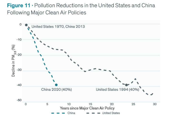 芝加哥大學的報告還對比了中美治理大氣污染所需的時間!秷蟾妗凤@示,美國從20世紀70年代初開始著手應對污染問題,經歷了幾十年的時間和數次經濟衰退才實現了中國在七年內完成的污染減少總量。