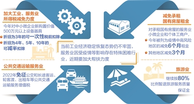 減稅降費體現出明顯的針對性、精準性。從總體部署看,今年要延續實施2021年底到期的支持小微企業和個體工商戶的減稅降費措施;完善研發費用加計扣除政策,加大增值稅留抵退稅力度,促進制造業企業科技創新和更新改造;針對受疫情影響重、就業容量大的服務業等特殊困難行業,研究精準幫扶的減稅降費措施。近日,國務院常務會議確定促進工業經濟平穩增長和服務業特殊困難行業紓困發展的措施,其中首要的就是減稅降費,包括加大工業、服務業所得稅減免力度,今年對中小微企業新購置價值500萬元以上設備器具,折舊為3年的可一次性稅前扣除,折舊為4年、5年、10年的可減半扣除;延長制造業中小微企業緩稅政策;擴大地方“六稅兩費”減免政策適用主體范圍至全部小型微利企業和個體工商戶。