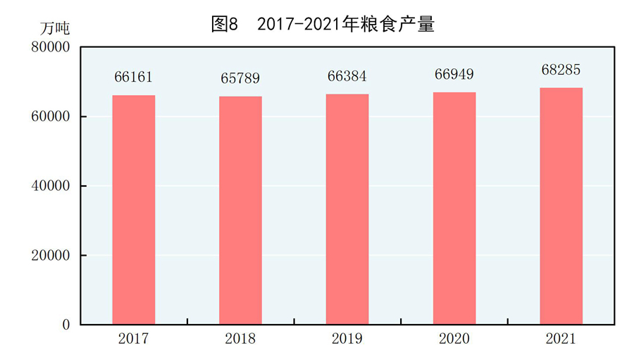 全年糧食產量68285萬噸,比上年增加1336萬噸,增產2.0%。其中,夏糧產量14596萬噸,增產2.2%;早稻產量2802萬噸,增產2.7%;秋糧產量50888萬噸,增產1.9%。全年谷物產量63276萬噸,比上年增產2.6%。其中,稻谷產量21284萬噸,增產0.5%;小麥產量13695萬噸,增產2.0%;玉米產量27255萬噸,增產4.6%。