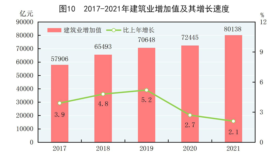 全年建筑業增加值80138億元,比上年增長2.1%。全國具有資質等級的總承包和專業承包建筑業企業利潤8554億元,比上年增長1.3%,其中國有控股企業3620億元,增長8.0%。
